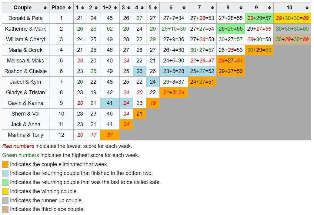 - This is the second season where the highest scoring couple (Maria & Derek in week 9) was eliminated (excluding the finals), the first being season 3 when Willa Ford was eliminated week 5, however, she tied for first, which means this is the first season where a couple gets eliminated after having the highest judges' scores to themselves.