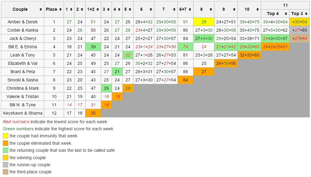 | 11 | 12 | Keyshawn & Sharna | 35 | 2 | 17.5 |