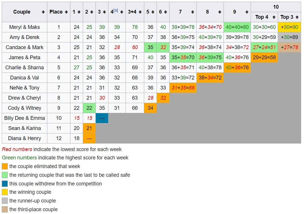 | 10 | 11 | Sean & Karina | 41 | 2 | 20.5 |