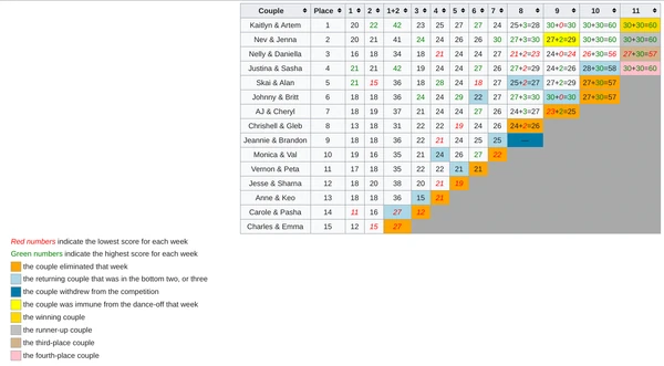 On 23 November 2020, Bachelorette star Kaitlyn Bristowe and Artem Chigvintsev were announced as the winners; Catfish host Nev Schulman and Jenna Johnson placed second; rapper Nelly and Daniella Karagach placed third, and actress Justina Machado and Sasha Farber placed fourth.